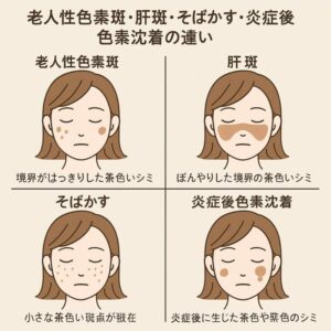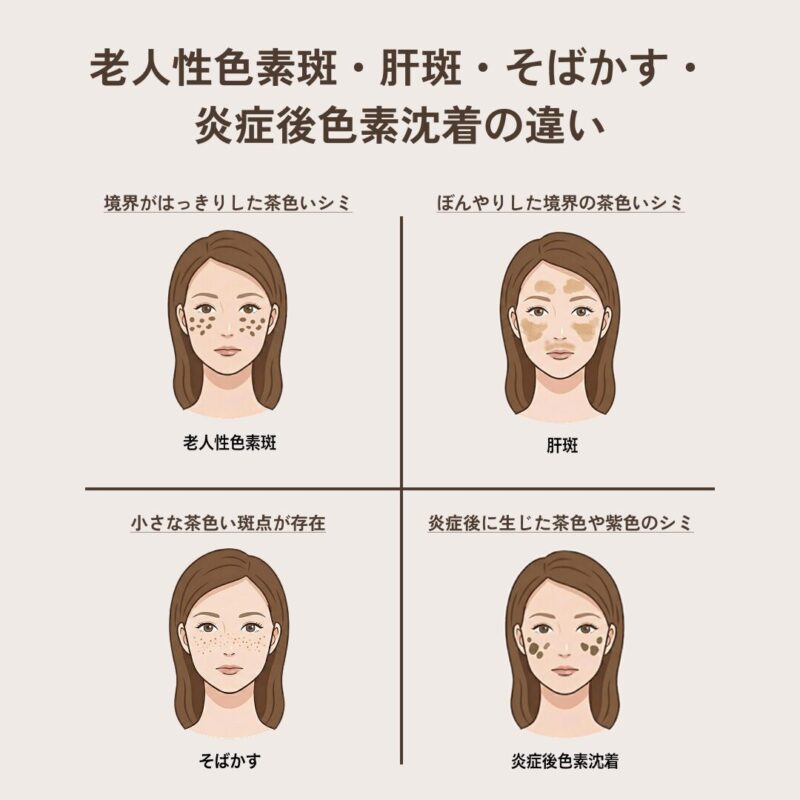 これに対して一般的なシミは、茶色や黒っぽい色をしており、輪郭がはっきりしているものがほとんどです。色味や形の違いを観察することで、肝斑と他のシミを区別しやすくなります。