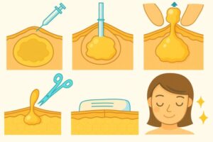これらの要因により皮膚の表面と内部の通り道が塞がれると、古い角質や皮脂が外に排出されず、内部に閉じ込められて嚢腫が形成されてしまうのです。