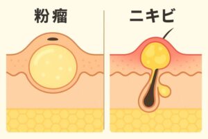 ニキビは毛穴の中で皮脂や角質が詰まり、アクネ菌が繁殖することで炎症が起こる皮膚疾患です。一方、粉瘤は毛穴の奥に袋状の構造ができ、その中に角質や皮脂がたまって膨らむ良性腫瘍として知られています。