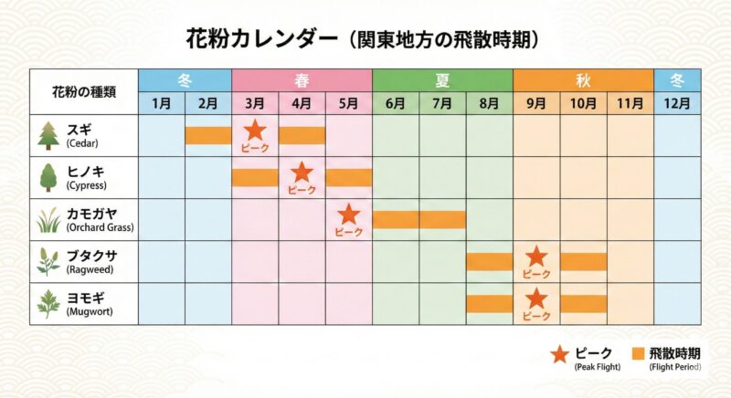 スギ以外の植物でも花粉症の症状が出ることがあります。日本では、春のスギだけでなく、その直後に飛散するヒノキ、初夏から夏にかけてのカモガヤ、さらに秋にはブタクサやヨモギといった花粉が1年を通して舞っています。